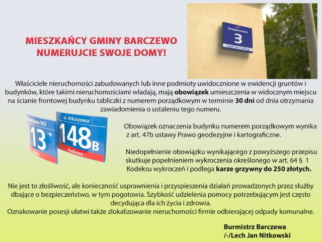 Burmistrz Barczewo informuje o obowiązku oznaczenia budynków numerem porządkowym. Niedopełnienie tego obowiązku podlega karze grzywny do 250zł.
