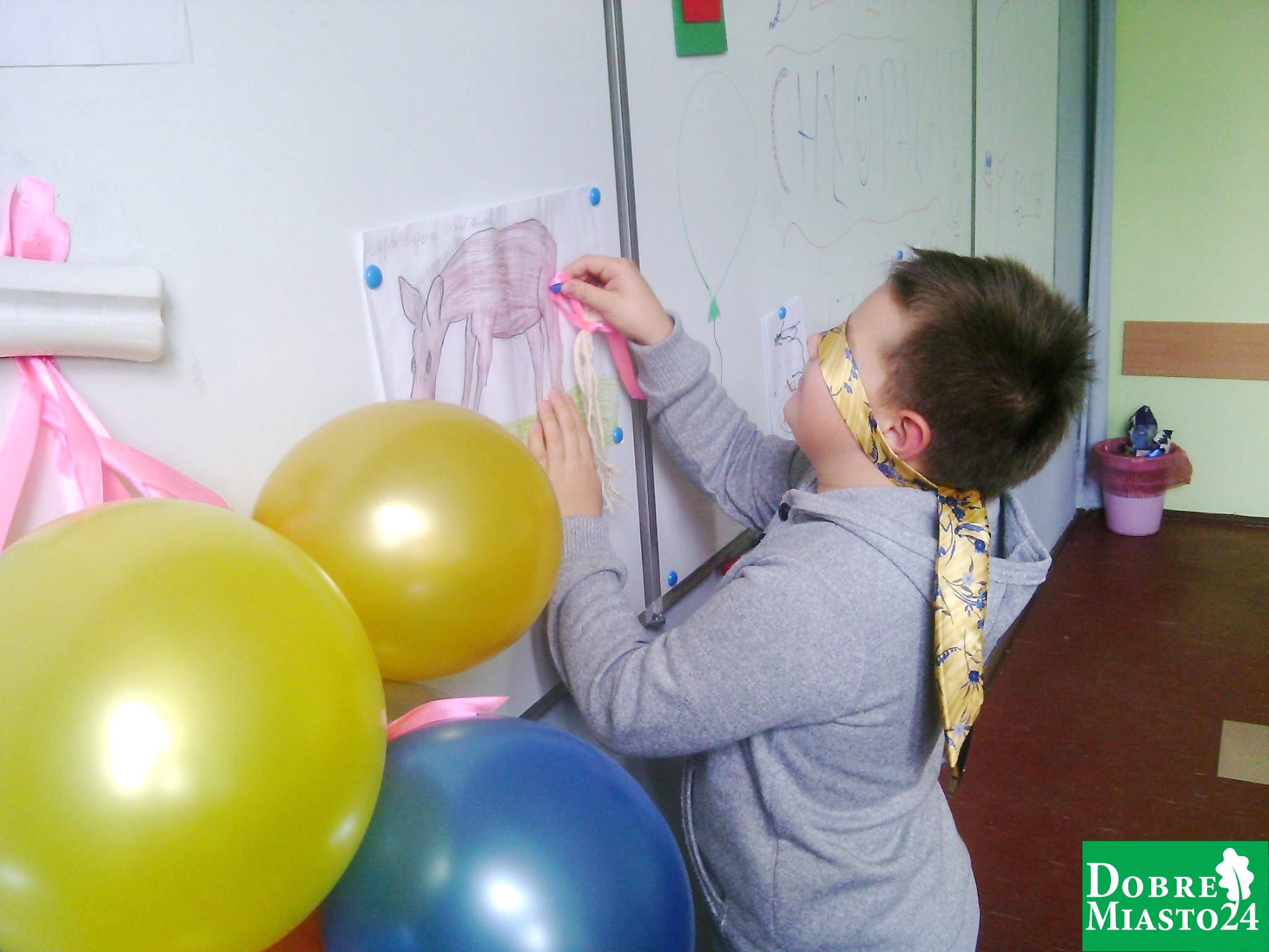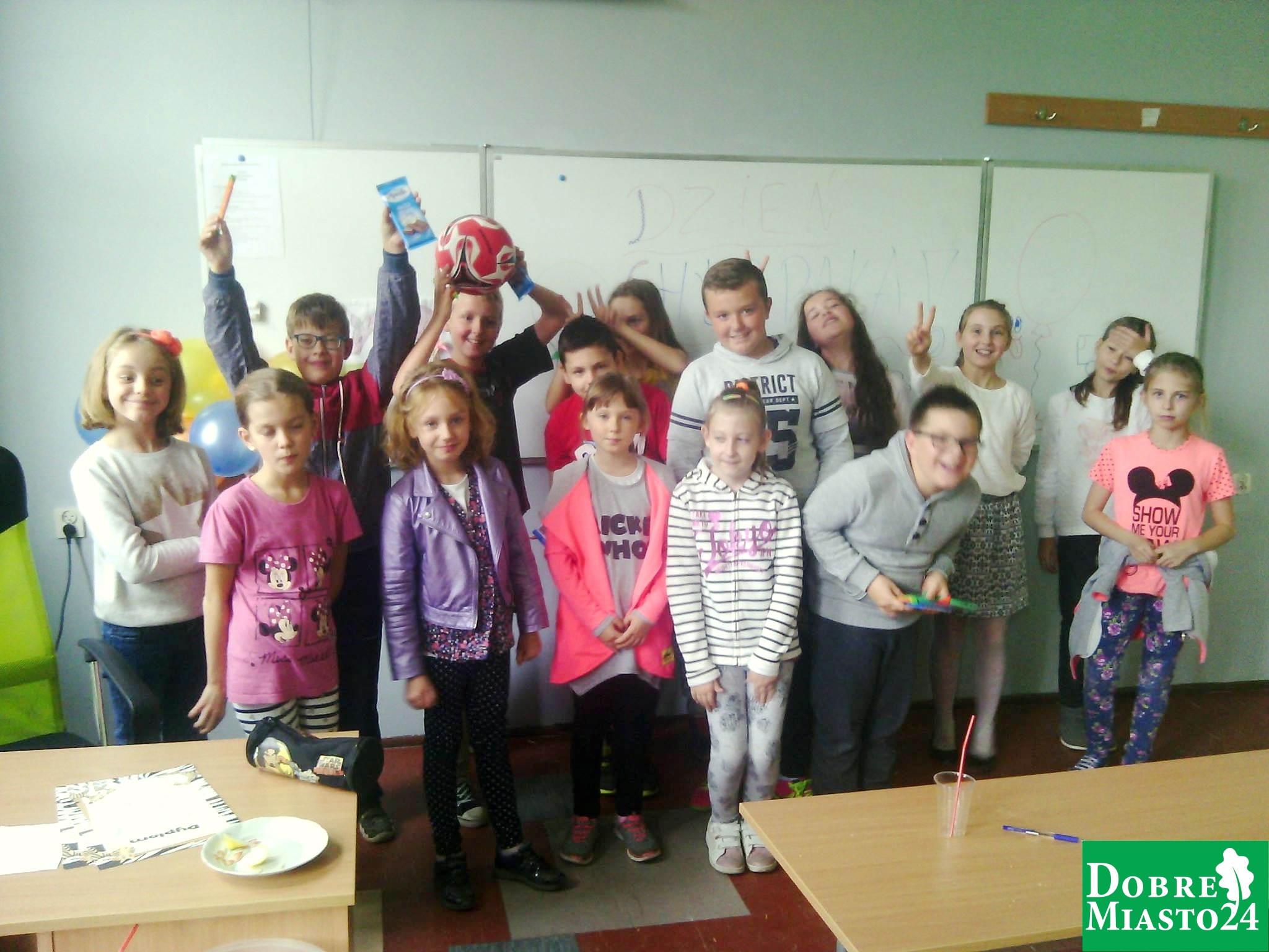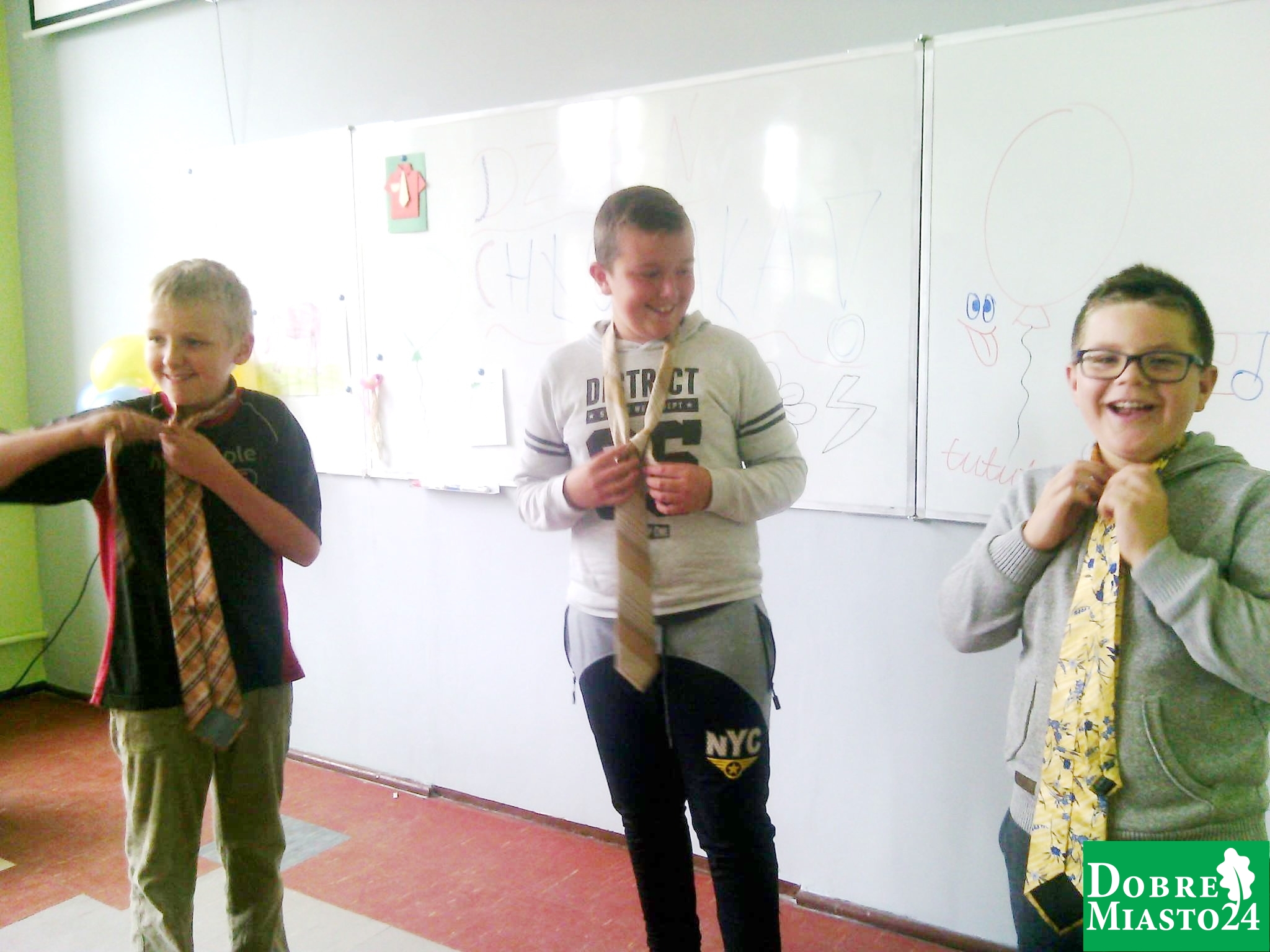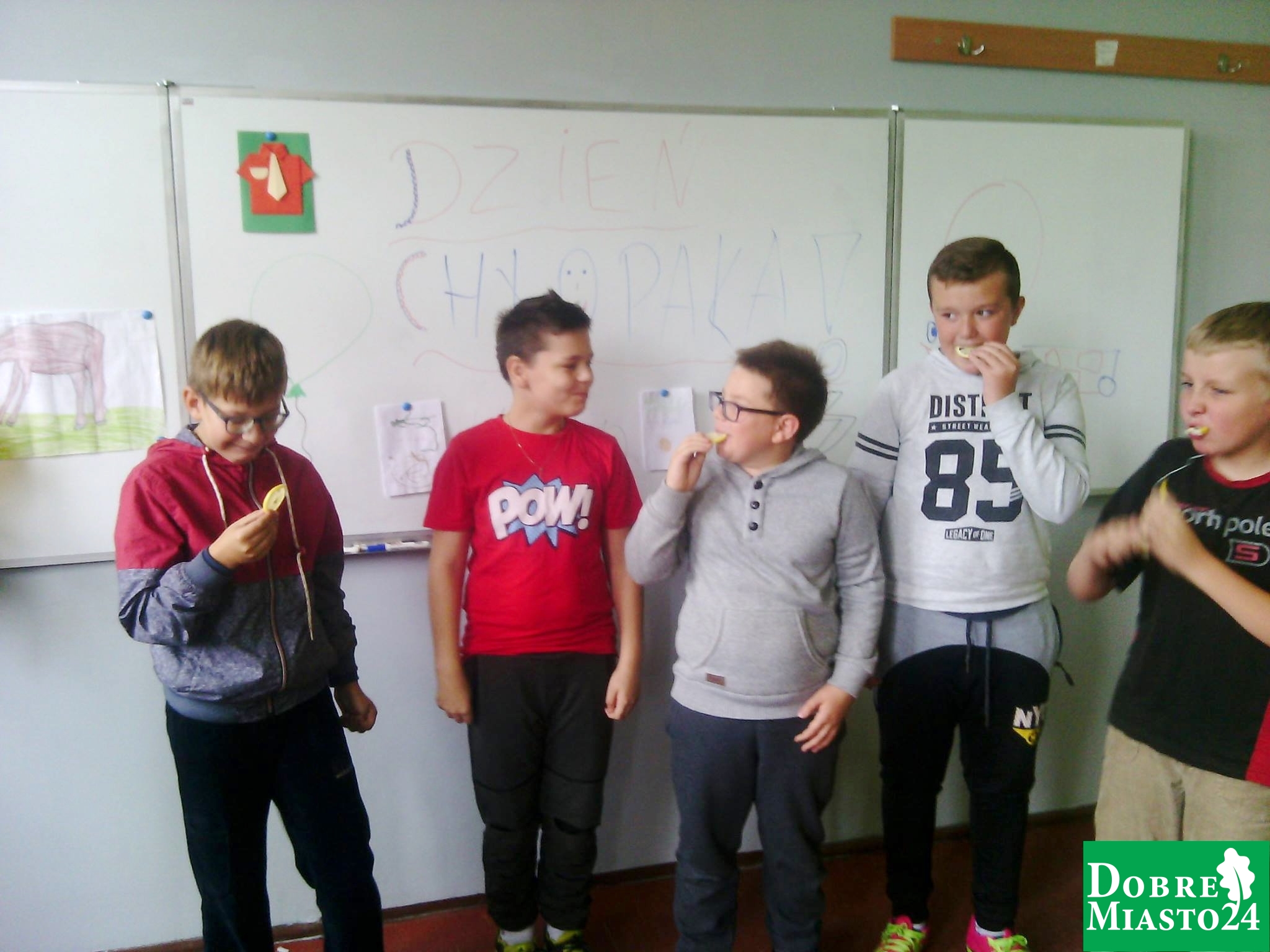 „Dzień Chłopaka” w klasie IV b to czas zabawy, radości i przyjaźni! Chłopcy dzielnie jedli kwaśną cytrynę, doczepiali brakujący ogon osiołkowi, zawiązywali krawaty, wysłuchali występów przygotowanych przez koleżanki z klasy oraz rozwiązali zabawny test na inteligencję. Tuż po dzwonku pobiegli na boisko szkolne z nową piłką ! Energii dostarczyły nam przekąski, owocowe soki oraz pyszne pączuszki przygotowane przez p. Joannę Mikuć. Klasa IV B serdecznie dziękuje wszystkim rodzicom za pomoc i wsparcie (p. Joanna Sirojć, Anna Lebiosz – słodycze, p. Aneta Czasnojć – przygotowanie cytryny do konkursu, państwo Agnieszka i Tomasz Romańczuk oraz p. Piotr Kochanowski za dostarczenie krawatów). Było przepysznie i bardzo wesoło !!!!