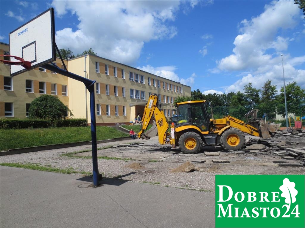 Uczniowie na wakacjach, a tym czasem w Szkole Podstawowej nr. 2 dzieje się; „Oj, dzieje się, dzieje… .Tyle ekip budowlanych na raz to jeszcze nie pracowało! Budowa boiska, naprawa dachu, remont toalet, sali lekcyjnej… Wspaniale!”