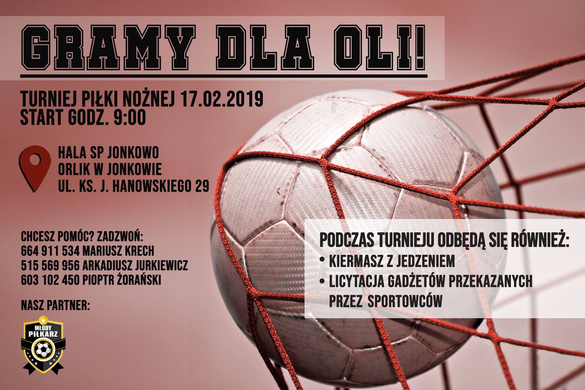 17 lutego 2019 r. na sali gimnastycznej i Orliku w Jonkowie, wspólnie z firmą ERKO organizujemy turniej charytatywny dla Oli Przytuły, która rozgrywa własnie swój najważniejszy mecz w życiu!