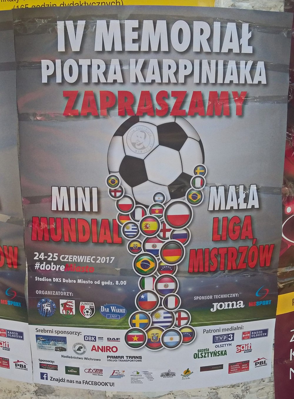 1.Potwierdzamy 24-25 czerwiec 2017 Dobre Miasto.Dlaczego właśnie Dobre Miasto?Dostaliśmy zaproszenie do przeprowadzenia właśnie tam IV Memoriału Piotra Karpiniaka od prezesa dobromiejskiego klubu Pana Adama Łopatko(prywatnie bardzo dobrego znajomego Piotrka),który przypomniał ,iż właśnie w DKS Dobre Miasto( wtedy Rolimpex Warfama Dobre Miasto) Piotrek rozegrał 1 sezon i w ten sposób chcą upamiętnić Piotrka. Dziękujemy za zaproszenie i chęć współorganizacji IV Memoriału Piotra Karpiniaka!