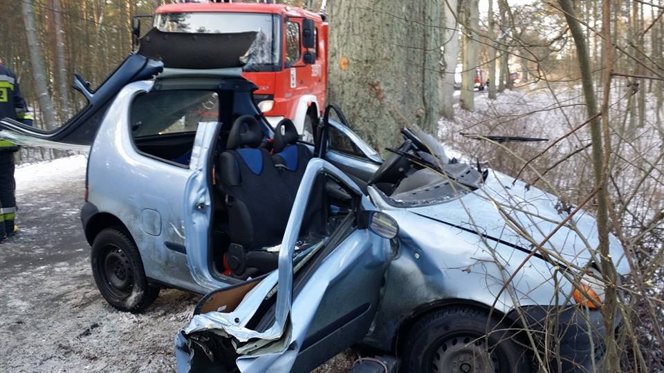 10.01.2016 Droga powiatowa 1449N m. Stary Dwor samochod osobowy uderzyl w drzewo. Jedna osoba poszkodowana w stanie ciezkim zabrana do SOR w Olsztynie.