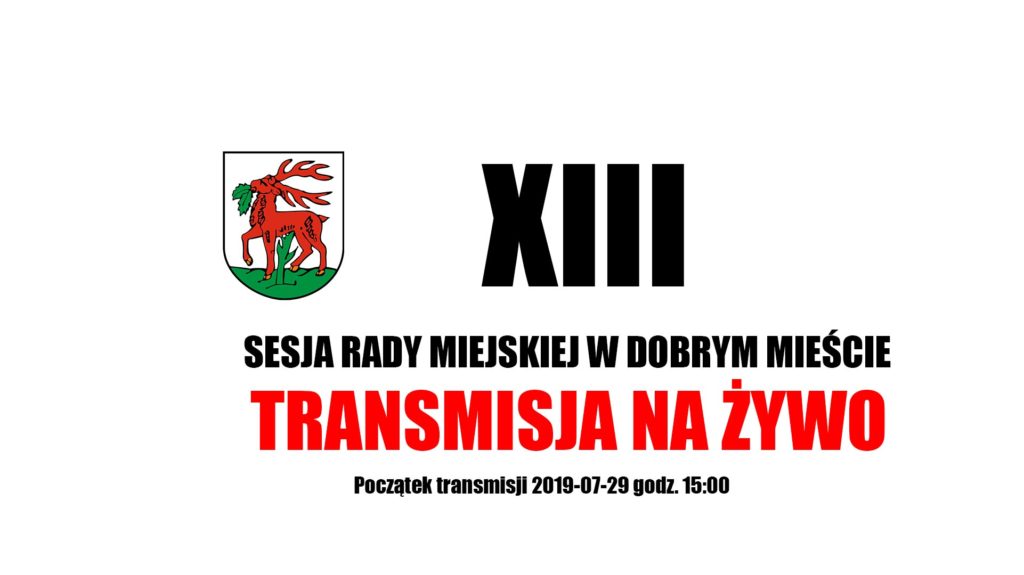 Przewodniczący Rady Miejskiej informuje, że w dniu 29 lipca 2019 r., tj. poniedziałek o godz. 15.00 w sali spotkań Centrum Kulturalno – Bibliotecznym w Dobrym Mieście, przy ul. Górnej 1A odbędzie się XIII-a sesja Rady Miejskiej w Dobrym Mieście, zwołana na wniosek burmistrza w trybie art. 20 ust. 3 ustawy z dnia 8 marca 1990 r. o samorządzie gminnym (tekst jednolity Dz.U. z 2019 r., poz. 506 z późn. zm.).