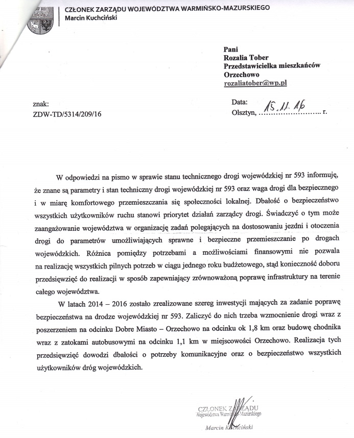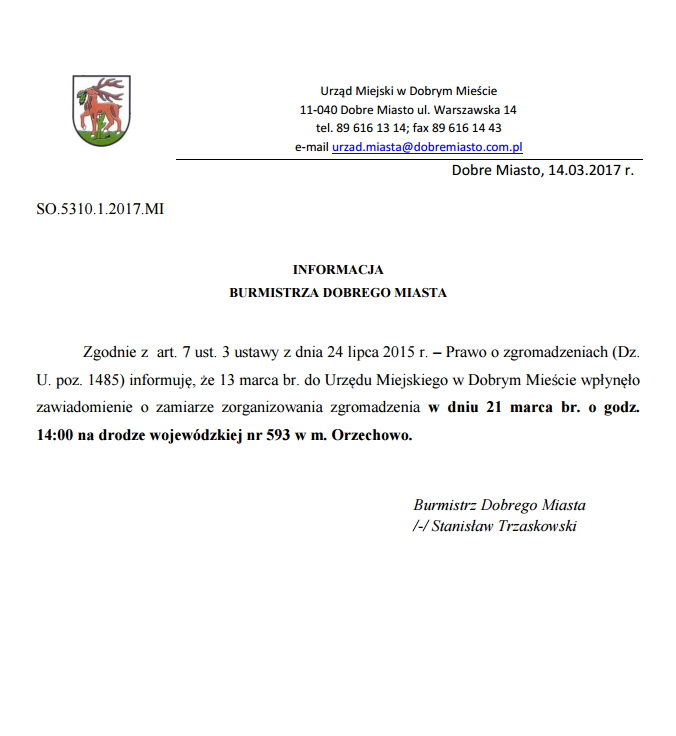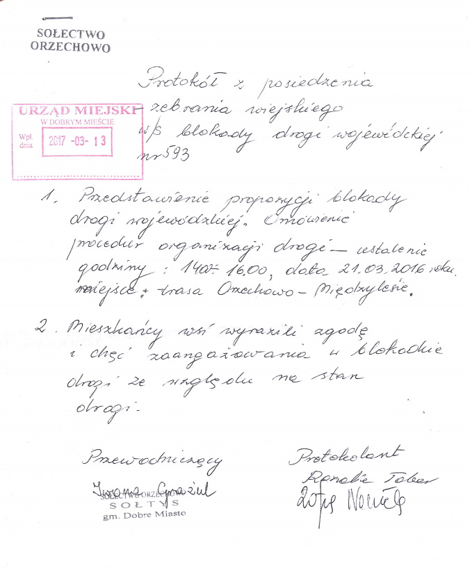 Dlatego też w dniu 21 marca o godzinie 14:00 mieszkańcy zorganizują zgromadzenie we wsi Orzechowo na drodze wojewódzkiej nr 593, które będzie polegało między innymi na ciągłym przechodzeniu przez przejście dla pieszych, co skutecznie zablokuje ruch samochodów. Blokada ma na celu „zauważenie” problemu jakości drogi.