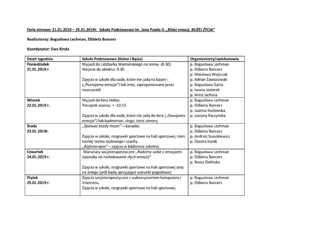 10 stycznia odbyło się w Szkole Podstawowej im. Jana Pawła II w Kolnie spotkanie z policjantem na temat bezpieczeństwa podczas zimowego wypoczynku w ramach akcji „Bezpieczne ferie 2019”. P. policjantka przypomniała uczniom o zagrożeniach dotyczących zabaw na śniegu i lodzie. Udzieliła rad, dotyczących zachowania w sytuacji, gdy pod ciężarem drugiej osoby załamie się lód. Przestrzegała przed korzystaniem z lodowisk na zbiornikach wodnych, czy zjeżdżaniem na sankach w pobliżu ulic.