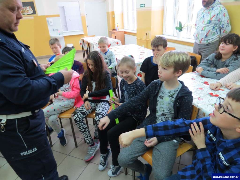 Aby nauka nie poszła w las, st. asp. Jarosław Bojarowicz przekazał uczestnikom półzimowiska opaski odblaskowe, natomiast dzieci obiecały, że będą nosić je na rękawach kurtek, nie zaś jak to czasami bywa, schowane do plecaka lub kieszeni.