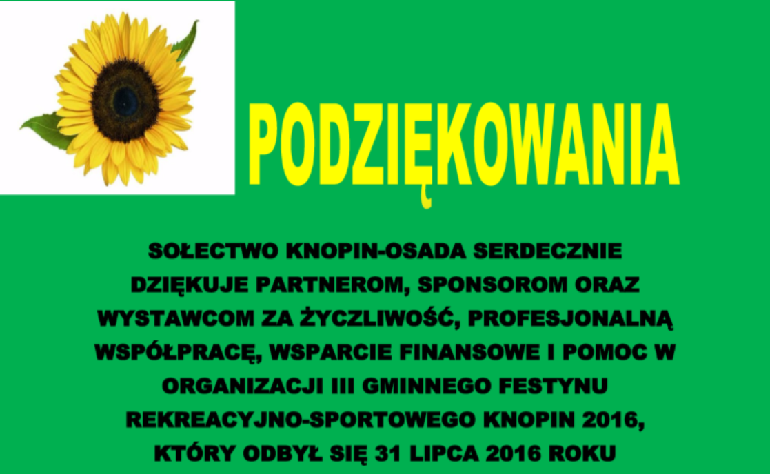 SOŁECTWO KNOPIN-OSADA SERDECZNIE DZIĘKUJE PARTNEROM, SPONSOROM ORAZ WYSTAWCOM ZA ŻYCZLIWOŚĆ, PROFESJONALNĄ WSPÓŁPRACĘ, WSPARCIE FINANSOWE I POMOC W ORGANIZACJI III GMINNEGO FESTYNU REKREACYJNO-SPORTOWEGO KNOPIN 2016, KTÓRY ODBYŁ SIĘ 31 LIPCA 2016 ROKU