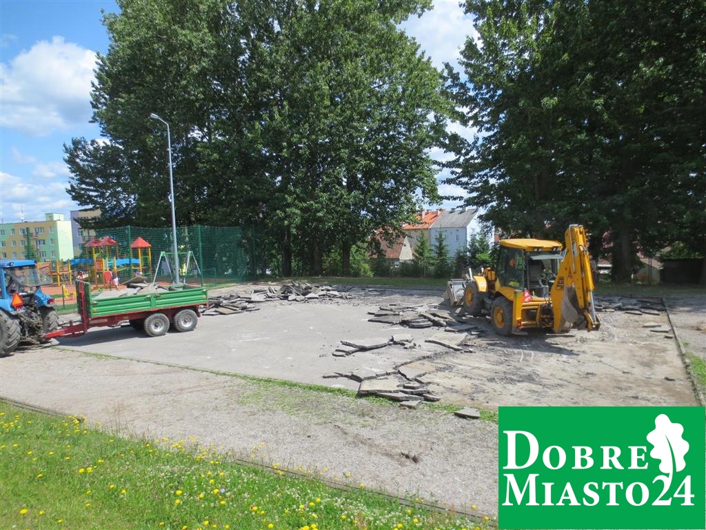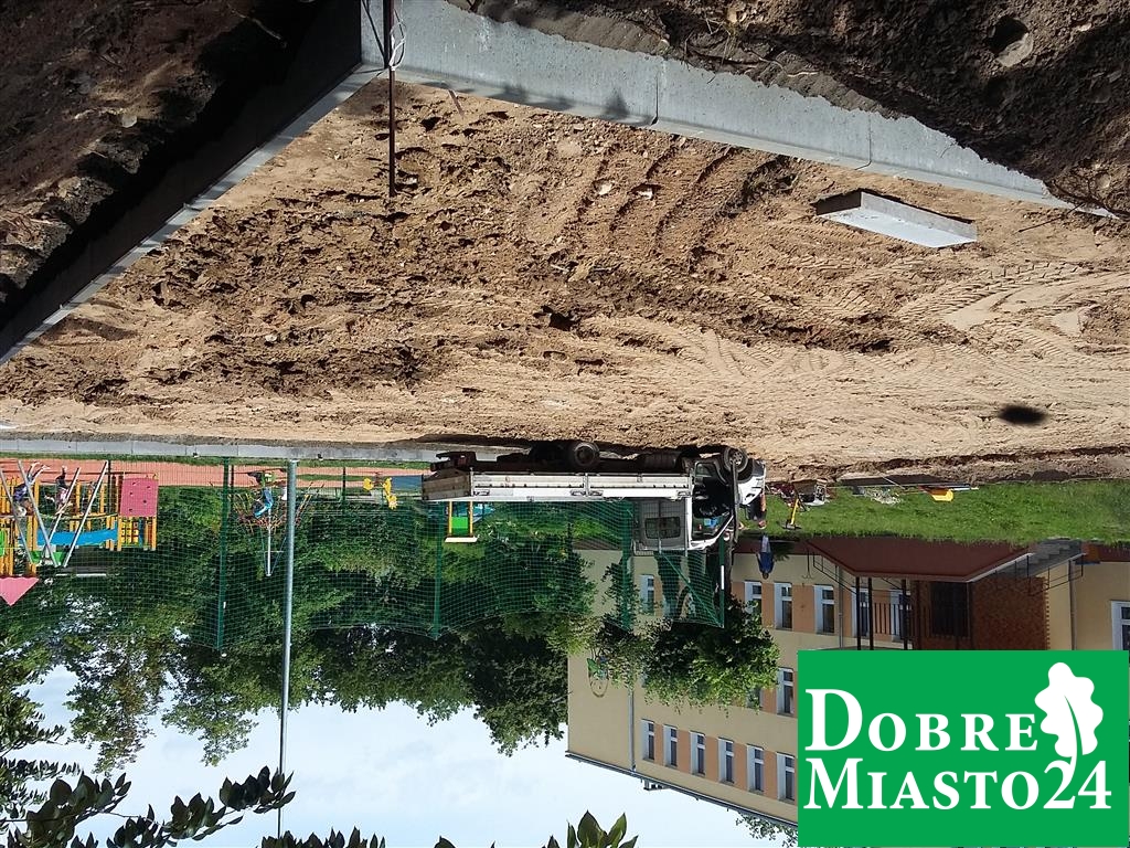 Uczniowie na wakacjach, a tym czasem w Szkole Podstawowej nr. 2 dzieje się; „Oj, dzieje się, dzieje… .Tyle ekip budowlanych na raz to jeszcze nie pracowało! Budowa boiska, naprawa dachu, remont toalet, sali lekcyjnej… Wspaniale!”