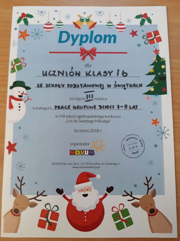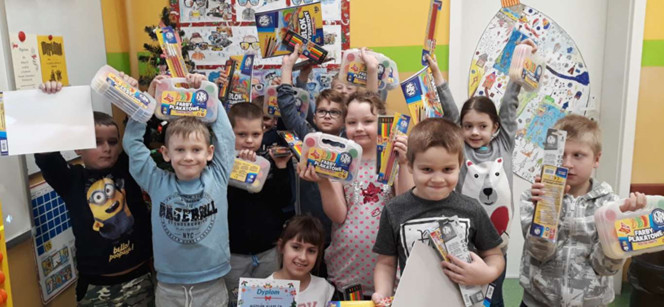 Zadaniem konkursowym było wykonanie pracy plastycznej pt. „List do Świętego Mikołaja” przedstawiającej gwiazdkowe marzenia. Pierwszaki pod opieką wychowawczyni Sylwii Wal-Mięszały wykonały piękne prace, zdobywając trzecie miejsce w Polsce.