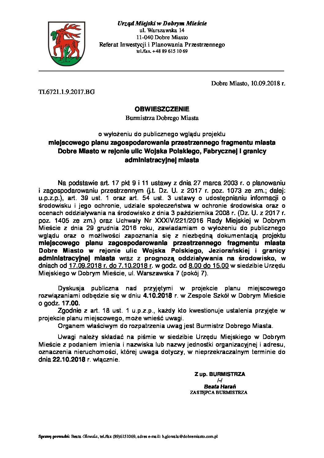 OBWIESZCZENIE Burmistrza Dobrego Miasta o wyłożeniu do publicznego wglądu projektu miejscowego planu zagospodarowania przestrzennego fragmentu miasta Dobre Miasto w rejonie ulic Wojska Polskiego, Fabrycznej i granicy administracyjnej miasta