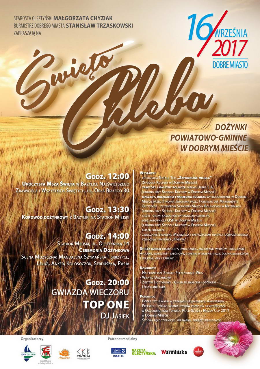 To odwołanie się do trudu, kunsztu rolników, rzemieślników i tradycji naszej kultury. To święto wieńczące porę żniw czyli Dożynki w których sołectwa z gminy Dobre Miasto i Powiatu Olsztyńskiego zaprezentują ekspozycje plonów, piękno i dorobek ich miejscowości. Społeczności sołeckie uczestniczą w konkursach na najpiękniejsze stoisko wiejskie, wieniec, a także tradycyjny zestaw chleba ze smalcem i ogórkiem. Po uroczystej Mszy uczestnicy dożynek przejdą barwnym Korowodem na Stadion Miejski gdzie rozpoczną się ceremonie dożynkowe. Oryginalnym wiejskim stoiskom, wystawie wieńców dożynkowych towarzyszyć będzie pokaz łapania dysków przez psy uczestniczące w Ogólnopolskim Turnieju Psich Sztafet Niczuk Cup 2017, pokaz sztuk walki w zapasach i elementach samoobrony czy konkurs na ujeżdżanie byka. Na ponad pięćdziesięciu stoiskach będziemy mogli otrzymać informacje rolnicze, zgłębić tematykę świata przyrody. Na dożynkowej scenie wystąpią zespoły: Anker, Serduszka, Lelija pod kierunkiem Sylwii Pacholec- Rudol i Dariusza Ejsymonta, Kolosoczok pod kierunkiem Piotra Tabaki, skrzypaczka Magdalena Szymańska, oraz gwiazda wieczoru TOP ONE.