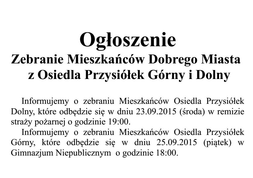 Informujemy o zebraniu Mieszkańców Osiedla Przysiółek Górny, które odbędzie się w dniu 25.09.2015 (piątek) w Gimnazjum Niepublicznym o godzinie 18:00.
